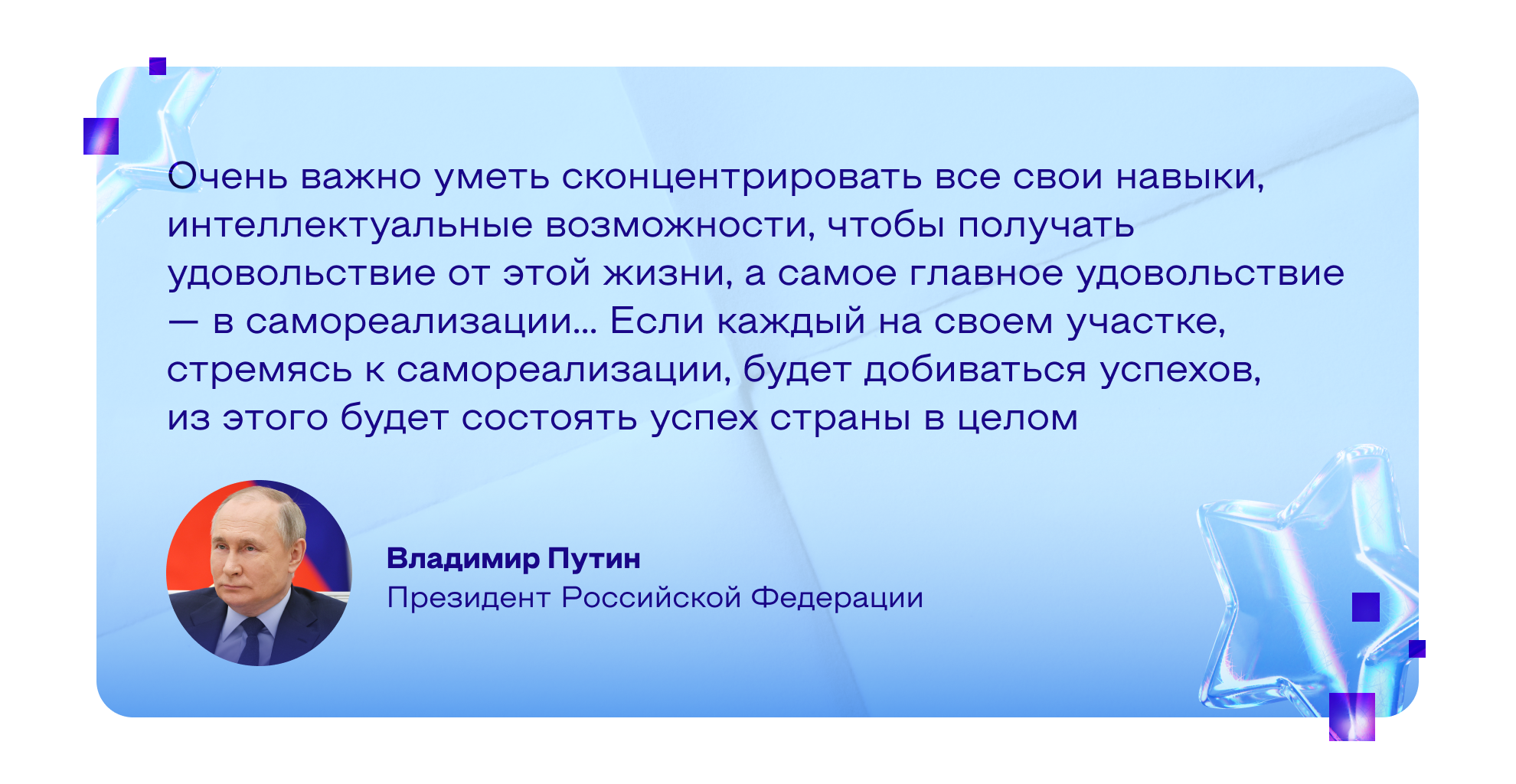 В России уже много лет последовательно создают все условия для самореализации. Развитие талантов каждого человека и воспитание патриотичной и социально ответственной личности — одна из национальных целей, закрепленных в Указе Президента РФ. Для её достижения в стране проходят масштабные программы, например национальный проект «Молодёжь и дети». По данным ВЦИОМ, уже 82% граждан отмечают, что у молодых людей сегодня есть возможность найти применение своим способностям и добиться успеха в жизни.