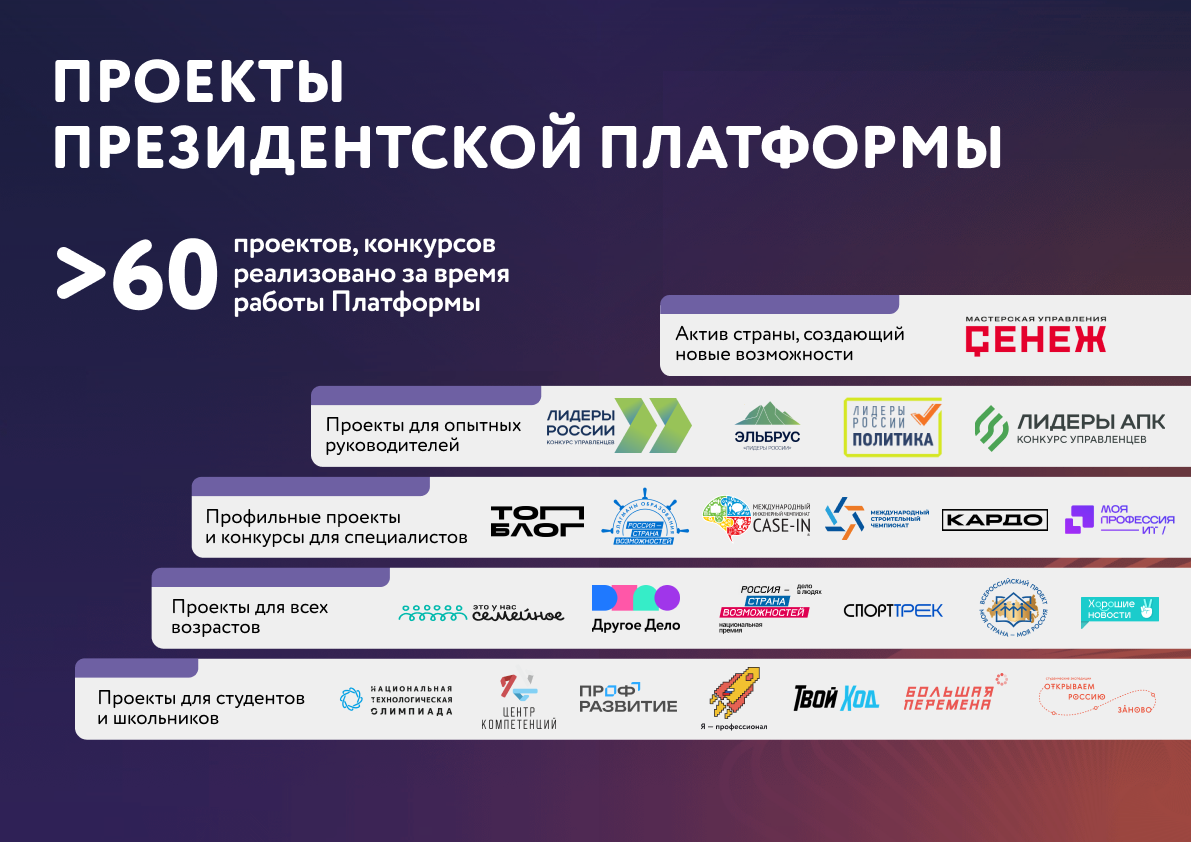 Важный элемент системной государственной политики в этом направлении — работа Президентской платформы «Россия — страна возможностей». Через конкурсы, проекты, образовательные программы она помогает людям разных возрастов направлять свою энергию, знания и таланты в те сферы, где их вклад принесет максимальную пользу — будь то наука и новые технологии, государственное управление или развитие образования и социальной сферы.